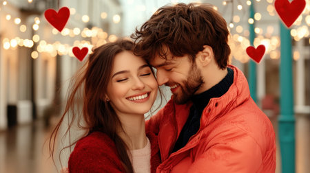 A joyful couple embraces during Valentine's Day, radiating love and happiness. The cozy atmosphere features heart decorations and soft candlelight, creating romance.