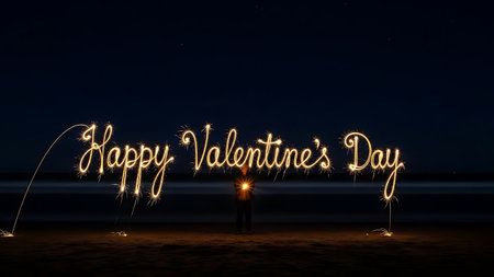 Happy valentines day written with sparklers on beach at night, romantic celebration, love, fire, light painting, festive atmosphere