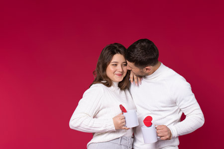 A loving couple cute chats on a red background with a cup of tea. Seeing off a young kissing couple. High quality photo