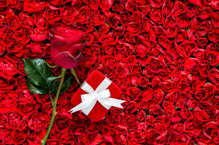 Rose with a present box put on red roses background for anniversary and Valentine's day concept.