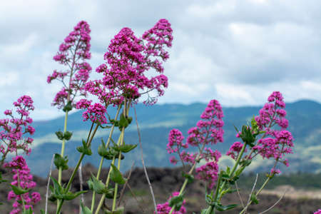Flora of Mount Etna volcano, seasonal blossom of pink Centranthus ruber Valerian or Red valerian, popular garden plant with ornamental flowers.