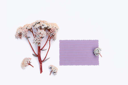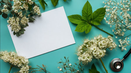 A serene composition featuring fresh white flowers and green leaves arranged around a blank card on a blue background, perfect for spring-themed designs and wellness projects.