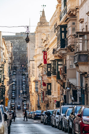 Valletta, Malta – April 9, 2025: Sunlit narrow street lined with limestone buildings and colorful Maltese balconies, parked cars, and spring city life