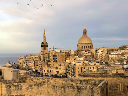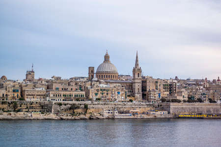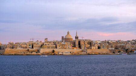 Panoramic view of Valletta Skyline at beautiful sunset from Sliema with churches of Our Lady of Mount Carmel and St. Paul's Anglican Pro-Cathedral, Valletta, Capital city of Malta