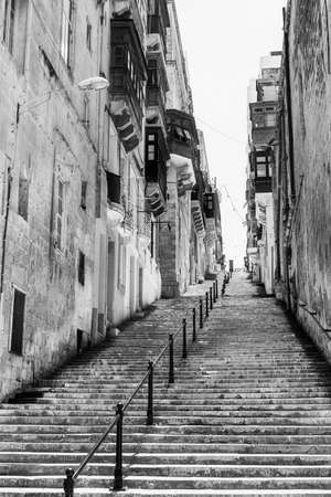Typical narrow street with stairs on the island of Malta. Buildings with traditional colorful maltese balconies in historical part of Valletta. Black and white picture