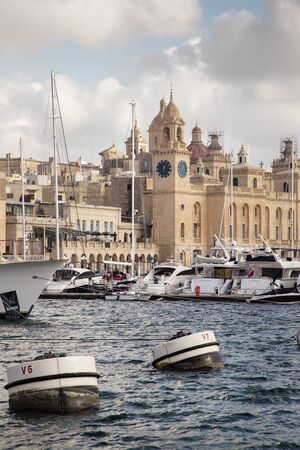 Birgu, Malta - September 1, 2019: Yachts and boats anchored at Grand Harbour Marina of Birgu (Vittoriosa) in Malta, with embankment and Maritime Museum building.