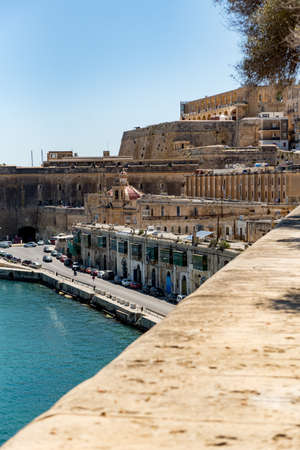 Seafront, amazing view of historic La Valletta with Lower Barrakka gardens, taken from Upper Barrakka garden, capital city, Malta