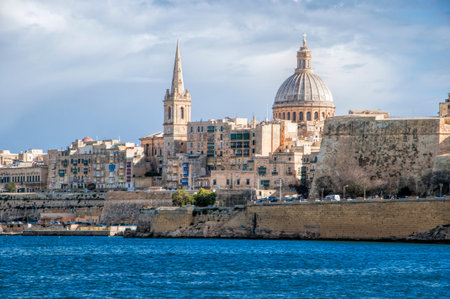 Valletta waterfront with cathedral dome and spire on Grand Harbour