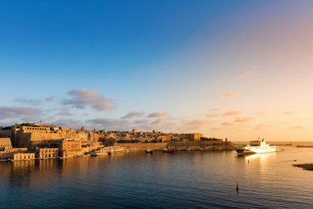 Sunrise over Valletta with ferry entering the harbour, Malta