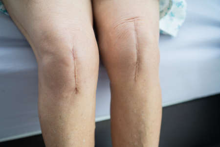 Asian senior or elderly old lady woman patient show her scars surgical total knee joint replacement Suture wound surgery arthroplasty on bed in nursing hospital ward, healthy strong medical concept.