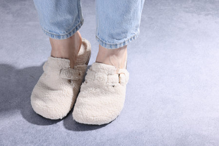 Legs of a man in black flip flops stand on a tiled floor texture background, top view.