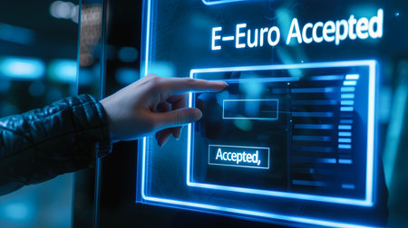 Person using virtual interface for transactions with e-euro, representing digital currency acceptance