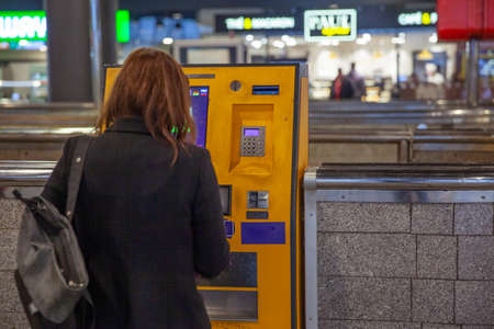 Vending machine for city transport and train, the main station. woman buying a ticket