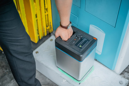 close up of male hand holding electric vehicle swap battery at swapping station