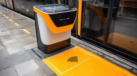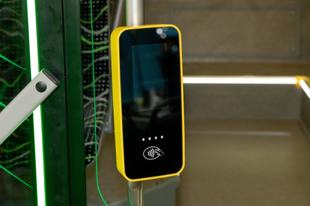 Close-up of a smart mobility card scanner on a tram platform ready for seamless travel access