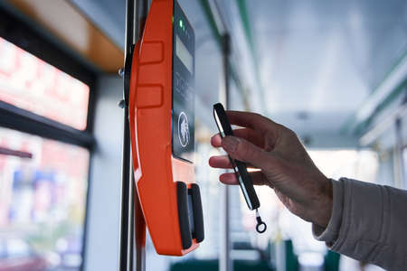 Man buying ticket via digital wallet. Contactless paying for public transportation with mobile phone.