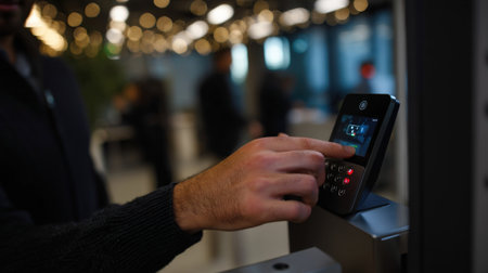 Medium shot of a person scanning fingerprint at a biometric access point illustrating secure ID verification for controlled entry and identity confirmation.
