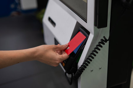 Close-up view of a hand of a female tourist putting a ticket onto a blue magnet electronic area of a chromed turnstile in the subway or a railway station depot, selective focus, shallow depth of field