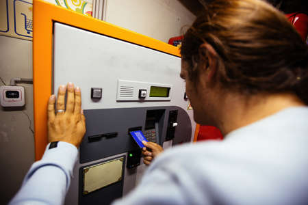New York, USA - May 29, 2018: Male hand puts Metro Card into a top up machine at a subway station in New York. A MetroCard is used as a ticket and can operate in two modes: Regular and Unlimited Ride.