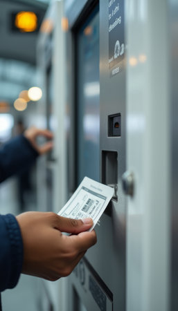 A close-up shot captures a hand poised to insert a ticket into a sleek vending machine, symbolizing the journey ahead. The blurred background hints at a bustling transit environment, evoking anticipation and the excitement of travel.