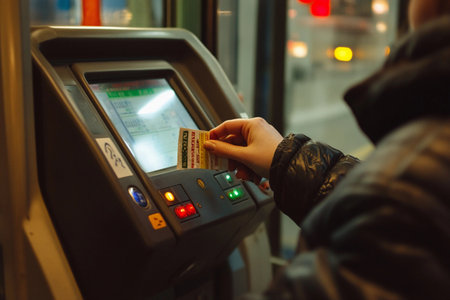 A person interacts with a ticket machine while waiting for their ride in a busy public transport setting at dusk. The atmosphere is lively, filled with city lights and movement.