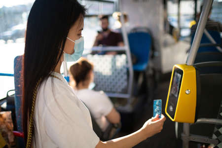 Asian woman paying conctactless with plastic card for the public transport in bus, tram or subway metro