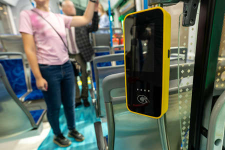 Contactless ticket validator on the bus. Payment of travel in municipal transport