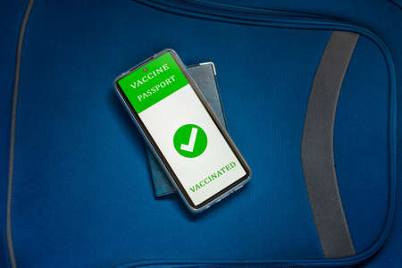 Personal identity document, travel luggage handbag and digital vaccine passport identification in mobile phone. New normal travel concept