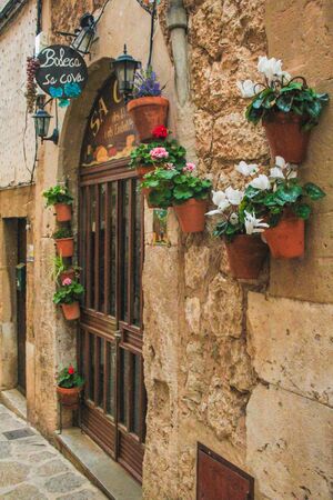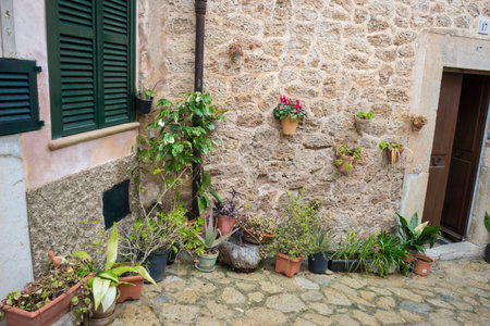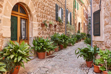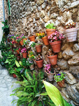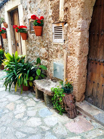 rustic, flowerpots street in the tourist island of Mallorca, Valdemosa city in Spain