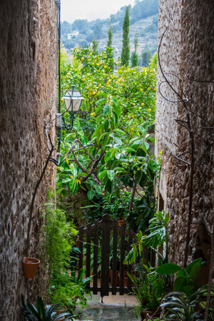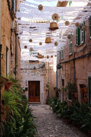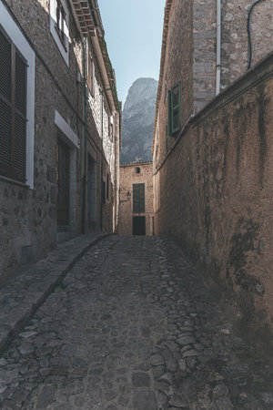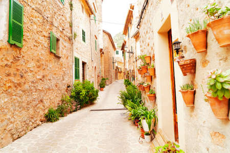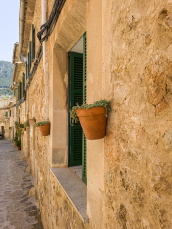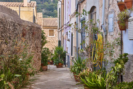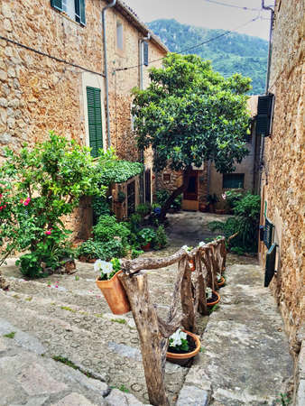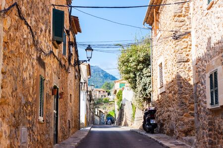 View of a medieval street in the Old Town of the picturesque Spanish-style village Fornalutx, Majorca or Mallorca island