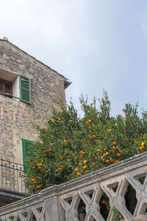 Beautiful orange tree with fruits against old traditional stone house with green window shutters in Valldemossa, Majorca, Spain.