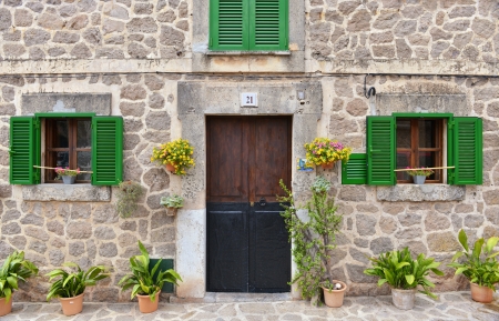 Traditional stone house with green shutters and flower pots in Valldemossa, Mallorca