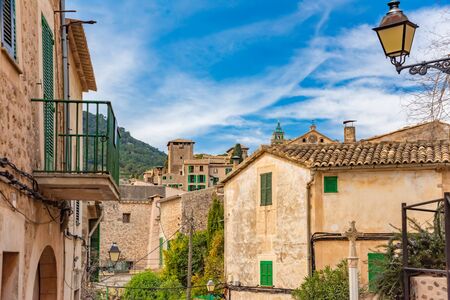 View of a medieval street of the picturesque Spanish-style village Valdemossa in Majorca or Mallorca island, Spain.