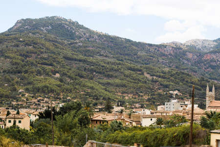 View of Soller panorama in Mallorca island, Spain. View of the mountains and coniferous forest. Panoramic view of the historical city in Mallorca island from Spain