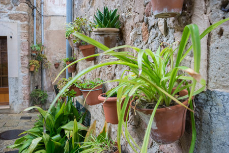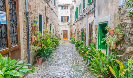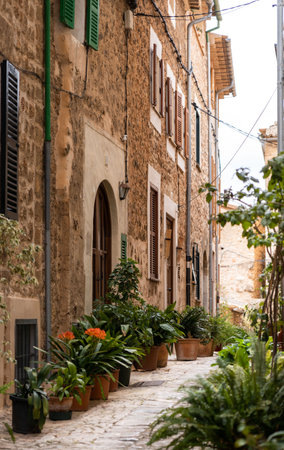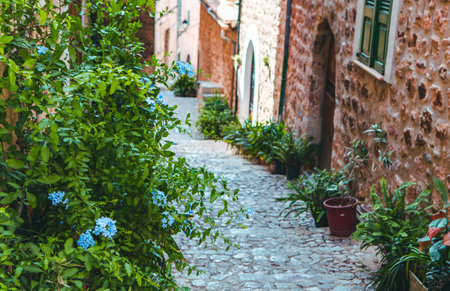 Traditional stone alley decorated with plants in Mallorca, Balearic islands