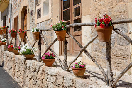 flowerpots street in the tourist island of Mallorca, Valdemosa city in Spain