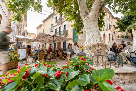 Fornalutx, Spain - November 1 2023: beautiful view with people in the cafe