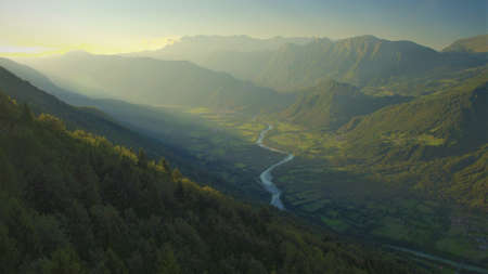 Scenic aerial view of a mountain landscape with a river winding through the valley, space for copy in the upper portion