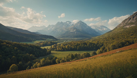A breathtaking mountain landscape showcasing a lush green valley with misty peaks in the background. The serene atmosphere invites exploration and relaxation.