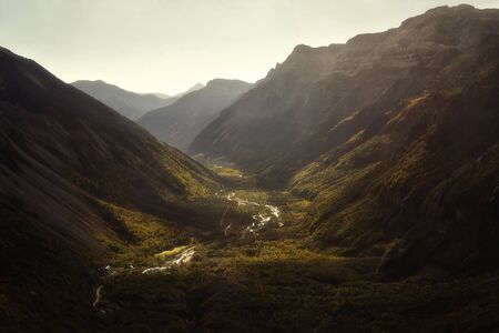 Mountain landscape with a river in the valley. Caucasus, Russia