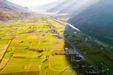 Beautiful view over the Chiavenna valley in the province of Sondrio, Italy - Sunset over the alps