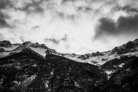 A dramatic black and white snowy mountain with strong clouds over it
