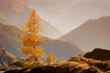 Larch tree in the mountains. Beautiful autumn landscape in the mountains.