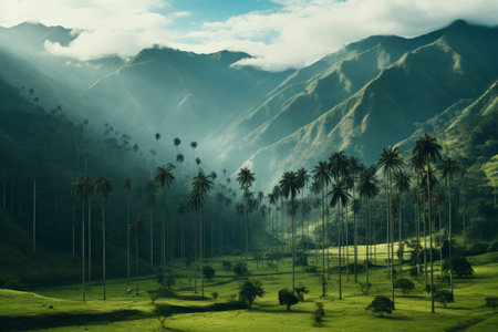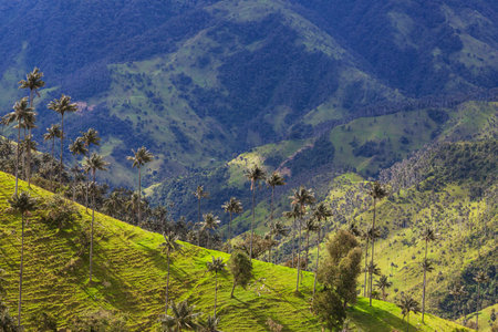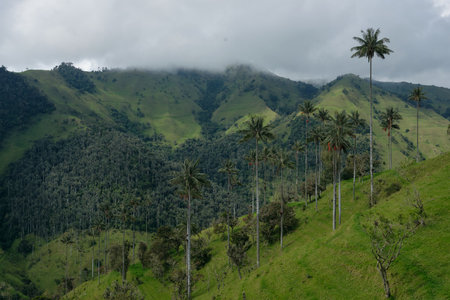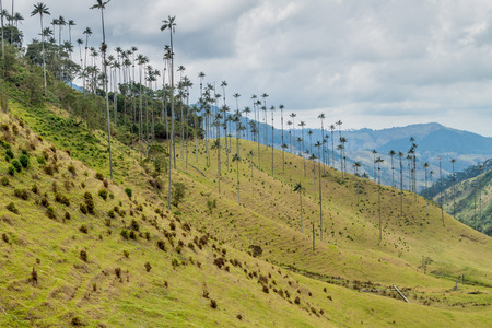 Cocora valley showing wax palm trees growing on mountainside in colombia