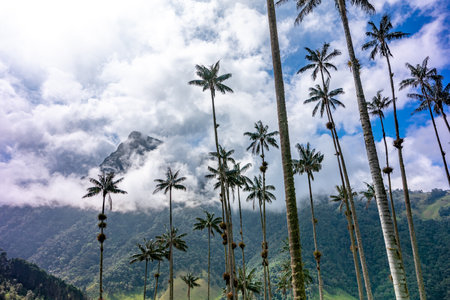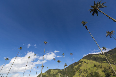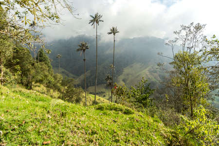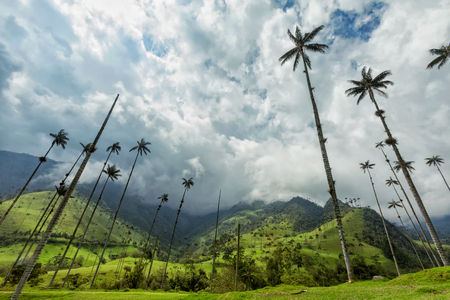 Wax palm trees, native to the humid montane forests of the Andes, towering the landscape of Cocora Valley at Salento, among the coffee zone of Colombia