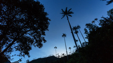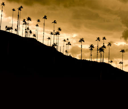 Landscape sunset of wax palm trees in Cocora Valley near Salento Quindio, Colombia