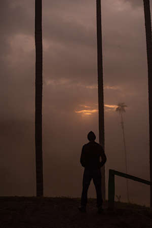 Man lookin sunset with wax palm tree in Cocora Valley near Salento Quindio, Colombia