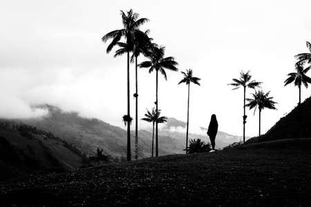 Tourist woman in Cocora Valley in the wax palm trees near Salento Quindio, Colombia