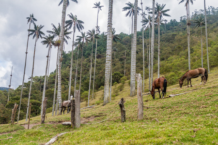 Horses graze under the tall wax palms in Cocora valley, Colombia