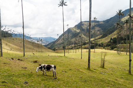 Cow grazes under the wax palms in Cocora valley, Colombia